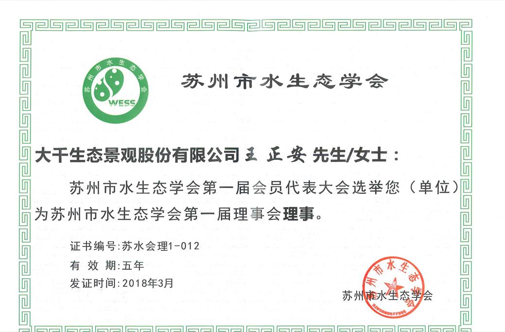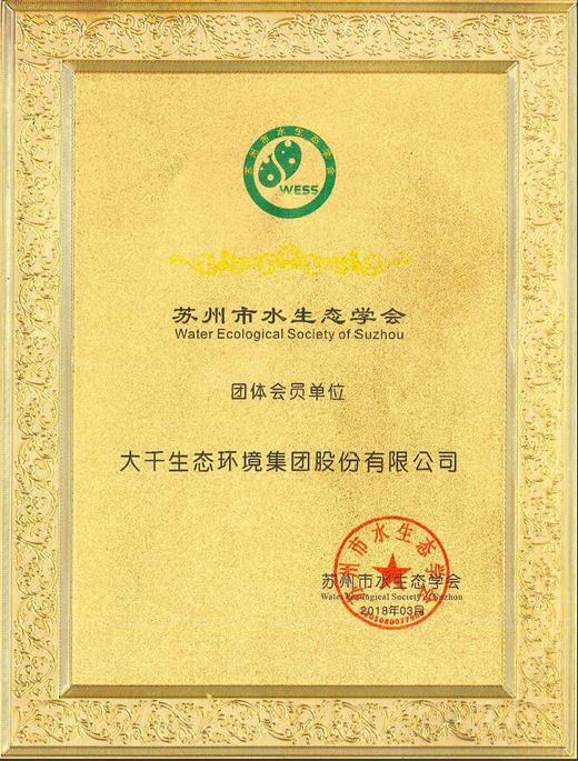 2018年3月,大千生態環境集團股份有限公司獲頒“蘇州市水生態學會團體會員單位”,集團執行總裁王正安先生獲選為“蘇州市水生態學會第一屆理事會理事”。